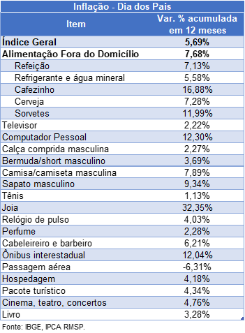 Os filhos que gostam de levar o pai para almoçar fora ou para uma viagem/atividade de lazer também vão gastar mais que no ano passado. O preço da refeição fora de casa subiu 7,13% e o do cafezinho 16,88%. Para os pais vaidosos, os serviços de cabeleireiro e barbeiro ficaram 6,21% mais caros e quem optar pelo cinema, teatro ou concerto pagará cerca de 4,76% a mais do que ano passado, abaixo da inflação geral. Por fim, no caso de viagens, os preços avançaram nos seguintes percentuais: hospedagem (+4,18%), ônibus interestadual (+12,04%) e pacote turístico (+4,34%). Assim, apenas a passagem aérea (-6,31%) exibiu queda de preços no período.